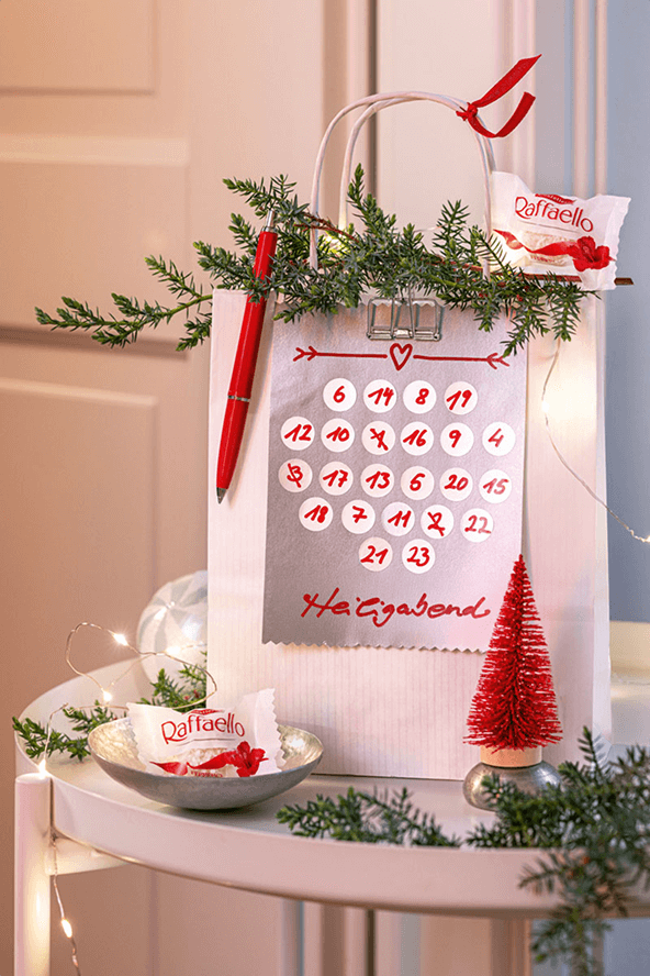 - Klebepunkte mit den Zahlen für die Kalendertürchen von 1 bis 24 beschriften und auf den Spitztüten anbringen. Spitztüten nach Belieben mit kleinen Geschenken, Seidenpapier und Spezialitäten von Ferrero befüllen.
