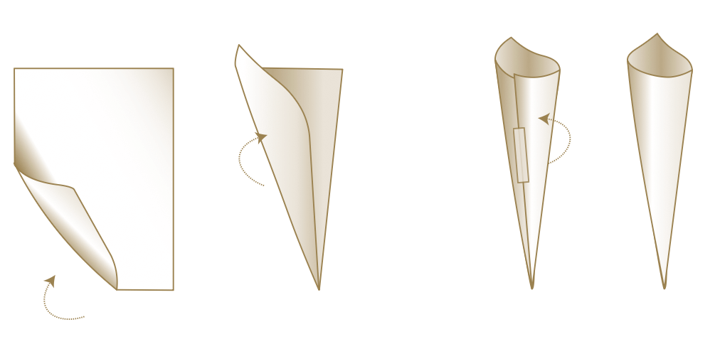 - Jeweils ein Blatt Bastelpapier im Hochformat nach Vorlage bereitlegen. Die linke untere Ecke diagonal zur Mitte hin nach oben aufrollen, sodass eine Spitztüte entsteht. Spitztüte auf der Rückseite mit Klebeband fixieren. Auf diese Weise alle Spitztüten herstellen.